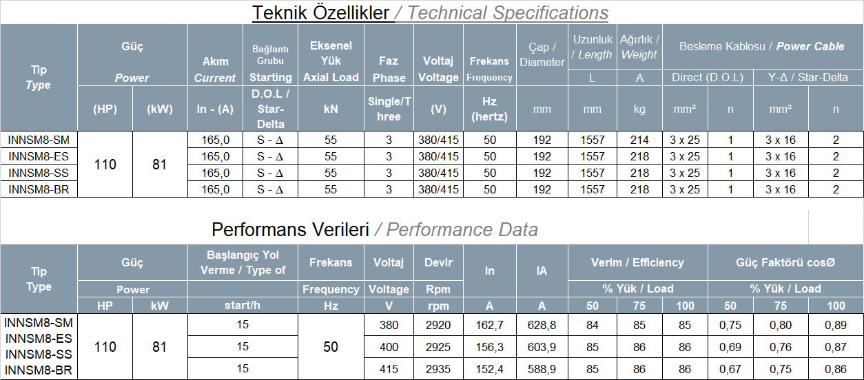 ● Axial load carrying capacity: 40HP-90HP motors and 45 kN 100HP-150HP motors 55 kN